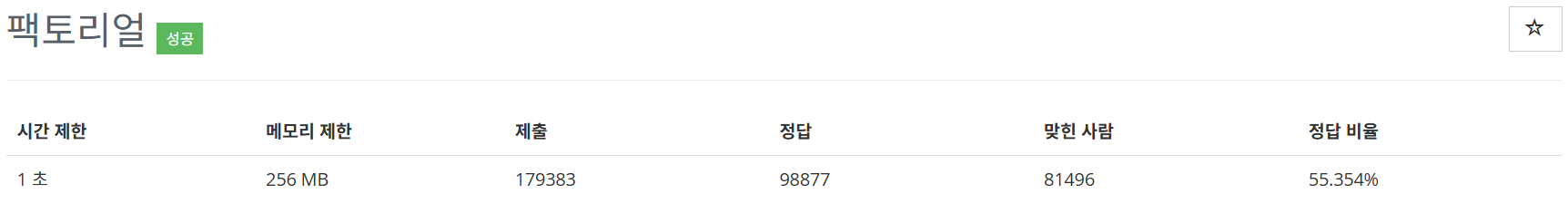 1. 팩토리얼은 n!라고 하면 1부터 n까지의 자연수를 차례로 곱하는 거다.