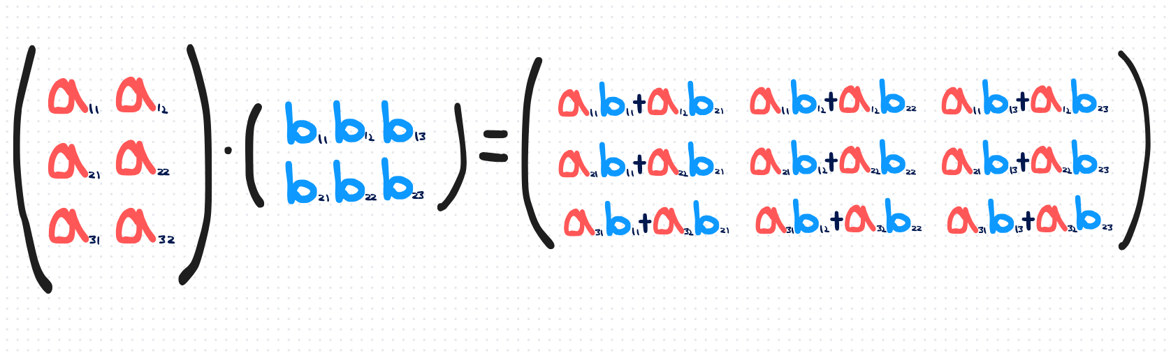 1. 행렬 곱셈은 A라는 2 X 3 행렬이 있고, B라는 2 X 3 행렬이 있을 때, C라는 3 X 3 행렬을 내뱉으며, A의 열과 B의 행이 동일해야 곱셈이 가능하다.