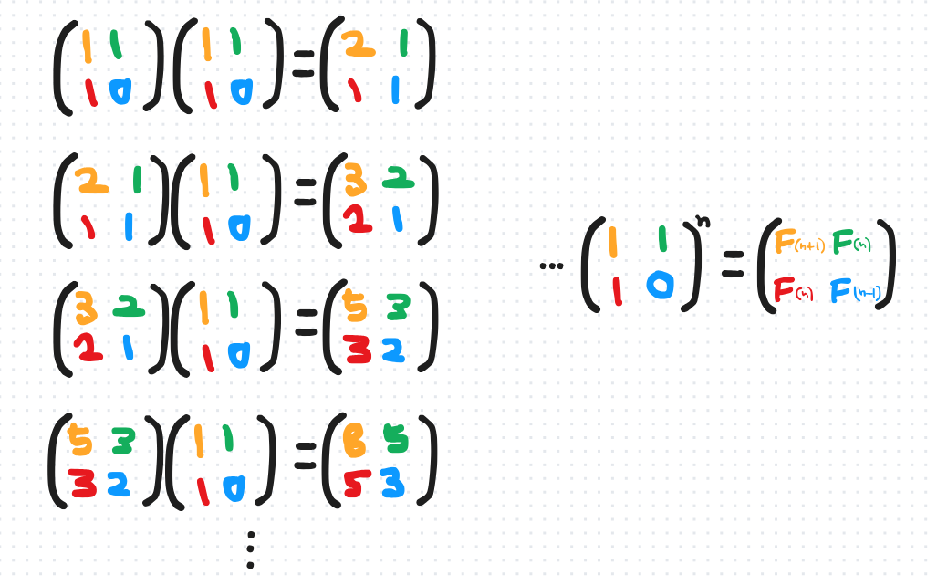 행렬 $\begin{pmatrix} 1 & 1 \\ 1 & 0 \\ \end{pmatrix}$ 을 계속 제곱하면 위 그림처럼 피보나치 수열이 구해진다. (2 x 2)행렬을 계속 곱하는 게 공간을 낭비하는 게 아닌가 싶었는데, 필요한 값만 남겨 구현하게 되면 DP로 구현하는 것과 다를 바가 없고, 오히려 공간이 더 필요하게 된다. 거듭제곱(분할정복)만을 활용해서 하는 방법도 있을 것 같긴 하다.