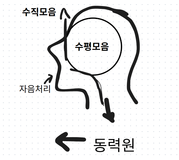 인체의 얼굴 골격을 상악, 하악이란 기준으로 윗부분, 밑부분으로 본다면 전제가 되는 소리는 하악을 포함하여 몸통까지 밑부분의 작용에 있다. 몸통의 호흡, 압력 작용과 그로 인해 맞춰지는 성대의 사용, 또 이로 말미암은 모음 체계가 전부다.