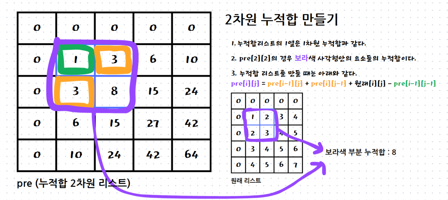 - 행(0)과 열(0)의 값 0도 1차원 누적합 리스트를 만드는 것과 마찬가지로 필요하다.