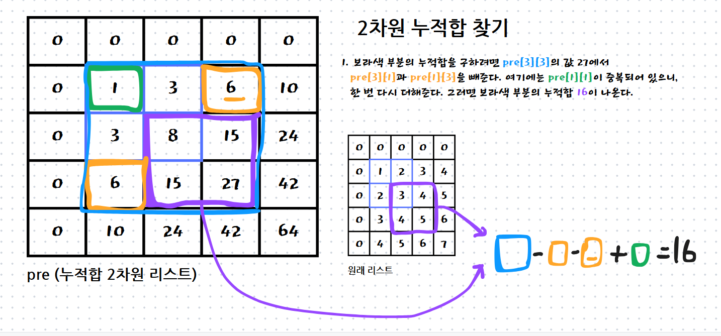 - 2차원 누적합 찾기와 반대로 위 누적합리스트를 구성할 때, pre[i-1][j-1] 부분이 2번 계산되어 있어 한 번 더 빼준다.