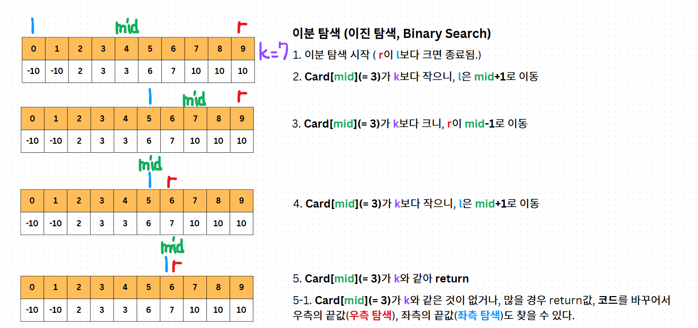 3. 이 문제는 k 의 갯수를 뽑아야 한다. 딕셔너리를 이용하거나, 이분 탐색 내에서 k와 동일한 값을 찾았을 경우에 추가 코드를 넣어주면 된다. (파이썬의 count( )는 시간초과가 나옴.)