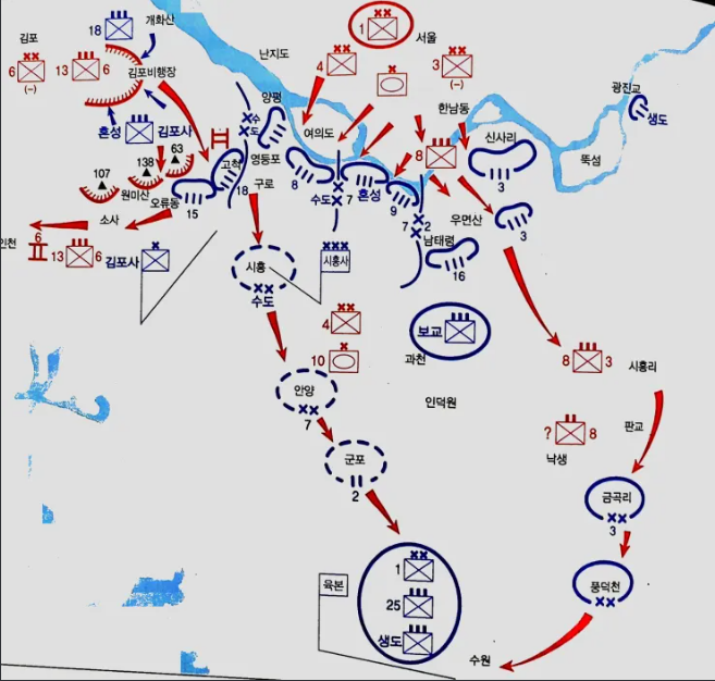 김포 지구에서 팔로군 출신 방호산의 북한 6사단은 오류동-소사 방면으로 공격해왔고 북한 4사단은 난지도, 증산동 방면으로 한강을 도하해 측면을 위협했다. 또 여의도비행장, 서빙고 지역으로도 진격을 해왔다. 북한군의 도하 시도를 7월 2일까지 저지했고 여의도지역은 북한군이 한강철교를 수리함에 따라 퇴각할 때까지 지켰다. 가장 중요한 초반 구도에 아주 소중하게 확보한 시간이었다.