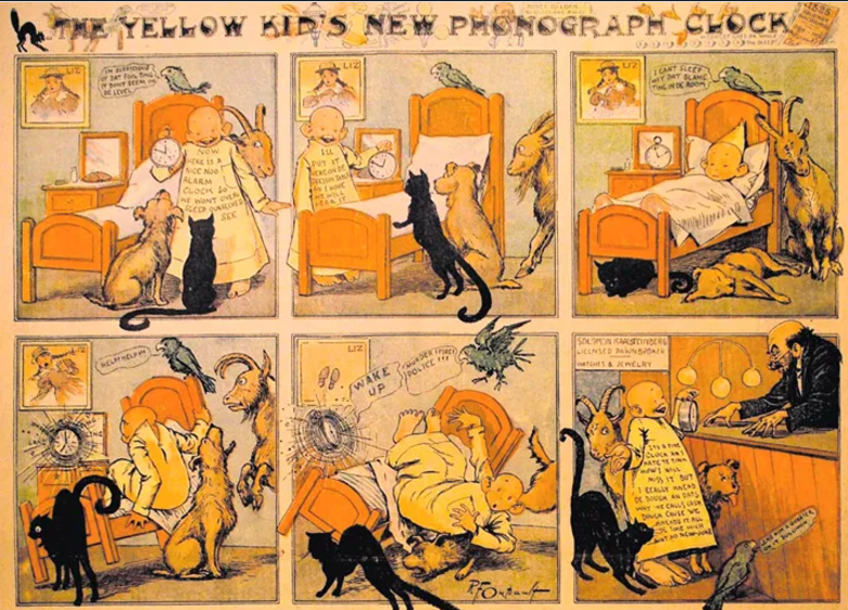 또 이 두 신문사는 '호건의 골목길'이라는 만화를 두고도 병맛같은 싸움을 이어나가는데, 이 만화의 작가 '아웃콜트'를 빼오려고 갖은 노력을 하게 된다. 결국 '모닝 저널'이 승리(?)했으며 이 만화는 '모닝 저널'에서 연재되기에 이르는데, '뉴욕 월드'의 필살기가 등장한다. '호건의 골목길' 만화의 주인공 '옐로 키드'를 특허 신청해놓은 거다. 결국 같은 작품에서 갈라져 비슷한 작품이 연재되는 지경에 이르렀고, 나중에는 인종차별 표현, 혐오조장과 더불어 도넘은 폭력성을 보여주는 작품이 되어버렸다고 한다.