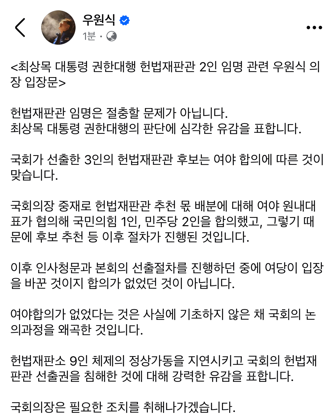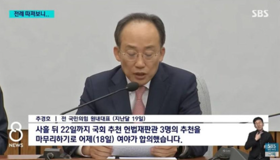 여야 합의를 계속해서 요구하는데 그냥 표면의 명분이겠지만 이미 국민의 힘 추경호 원내대표가 헌법재판관 임명에 대해 여야합의가 완료되었다고 한 기록이 있다. 그 걸 제외하더라도 정당한 표결로 행정부에 이송된 이 사안을 판단할 권한은 행정부에 없다.