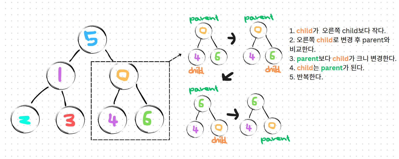 child += 1 # 범위 안에 있으면서 우측자식노드가 크면 우측으로 child변경