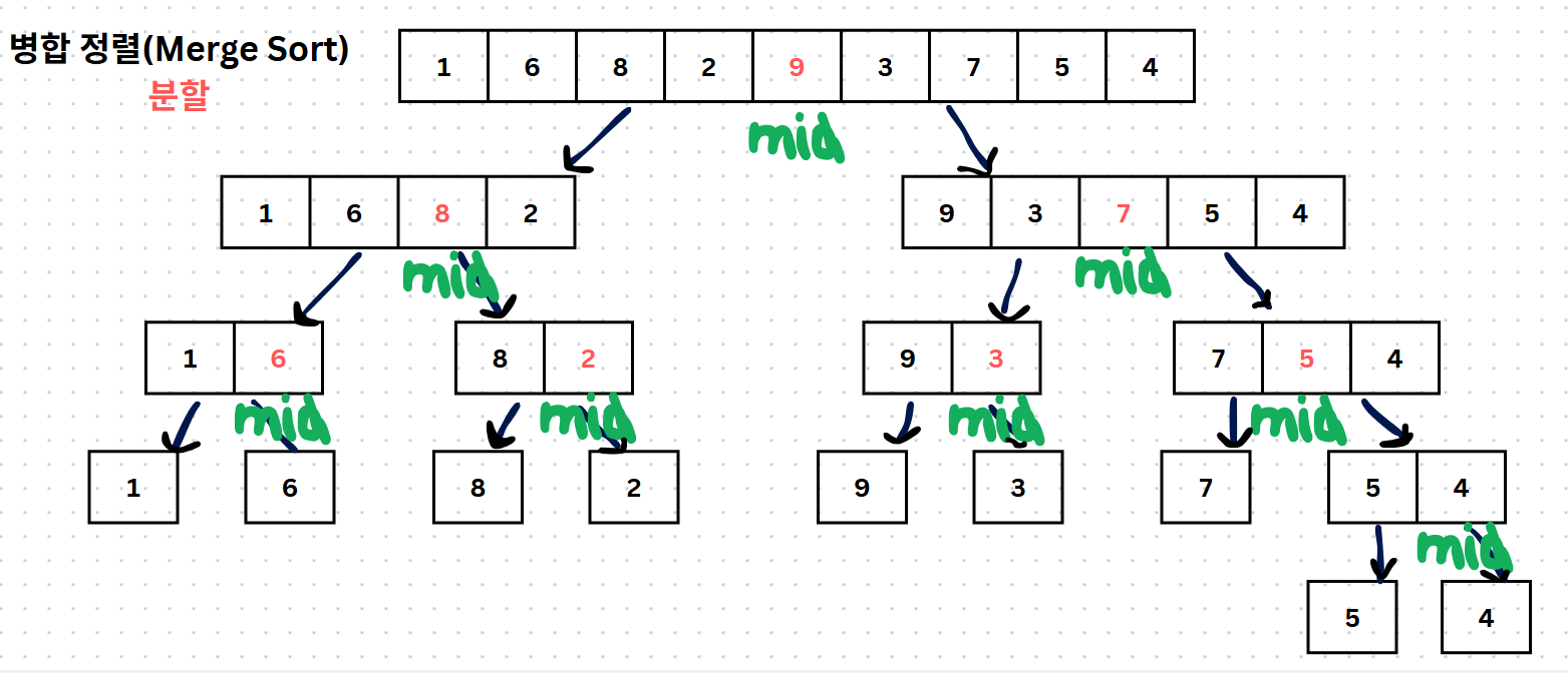 병합 정렬은 배열을 재귀함수로 계속 분할하고 끝에서부터 병합하면서 정렬이 되는 구조다. 타고타고 병합이 완료되면서 정렬된다.