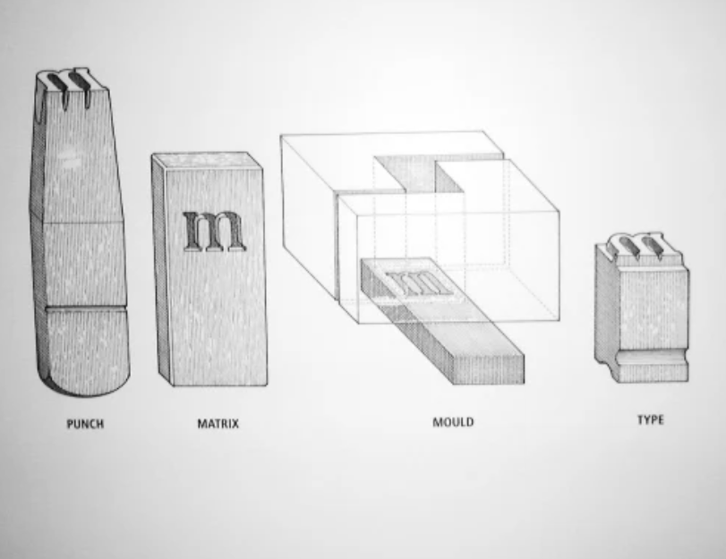 활자는 아래 그림에서 보듯이 3단 구조다. 철로 된 양각이란 글자가 튀어나온 틀을 만들고 이것을 구리판에 눌러 글자가 들어간 음각을 만들었다. 다시 철로 만들어져 있는 주조판에 음각을 넣고 납, 안티모니, 주석 합금을 부어 활자를 만들었다. 활자는 요철로 되어 있어 활자끼리 꽉 맞물릴 수 있었다.