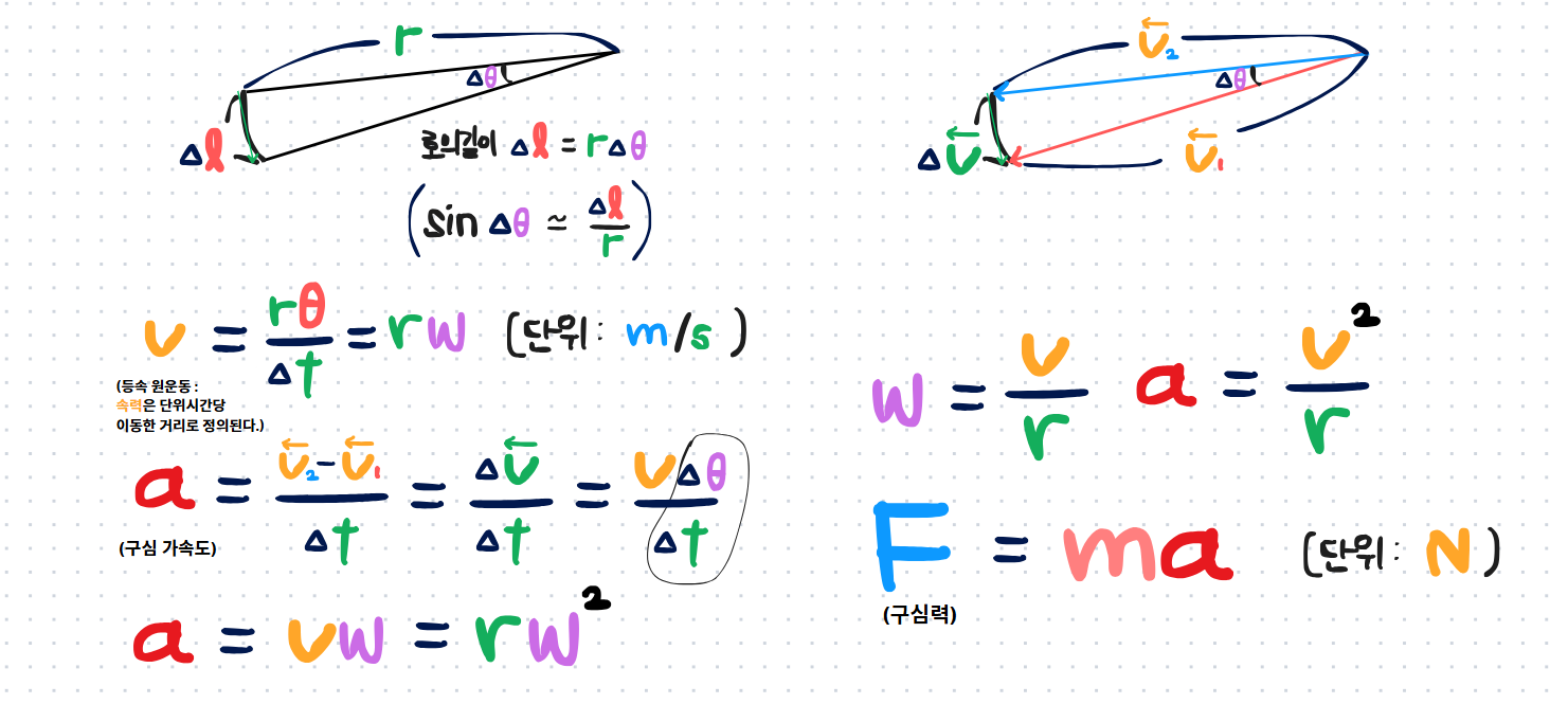 구심가속도는 원운동을 하는 물체가 원의 중심을 향해 작용하는 가속도다. 속도($m/s$)는 단위 시간당 이동한 거리의 변화율이고 가속도($m/s^{2}$)는 속도를 다시 한번 미분한 속도의 변화율이다. 원운동을 하는 물체의 속도 벡터가 $\vec{v_1}$에서 $\vec{v_2}$로 변할 때 벡터의 차이는 $\Delta \mathbf{v} = \vec{v_2} - \vec{v_1}$이다. 등속원운동에서 $\vec{v_1},\; \vec{v_2}$의 속도는 동일하고 방향이 다르다. 속도 벡터는 각속도($\omega$)와 물체까지의 거리($r$)를 곱한 값이다($v = \frac{r \theta}{\Delta t} = r \omega \quad \text{[단위: m/s]}$). $v$벡터에서 각속도만큼 방향 변화가 생기므로 $a = \frac{\vec{v_2} - \vec{v_1}}{\Delta t} = \frac{\Delta \vec{v}}{\Delta t} = \frac{v \Delta \theta}{\Delta t}$가 된다. 선속도($v = rw$)에 따라 이리저리 공식을 옮겨보면 아래와 같다.