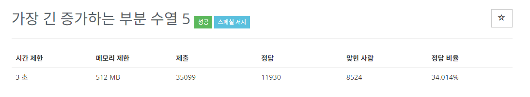 둘째 줄에는 정답이 될 수 있는 가장 긴 증가하는 부분 수열을 출력한다.
