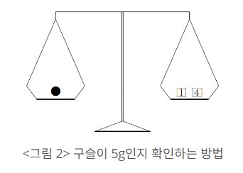 <그림 2>와 같은 방법을 사용하면 구슬이 5g인지도 확인할 수 있다. 구슬이 2g이면 주어진 추를 가지고는 확인할 수 없다.