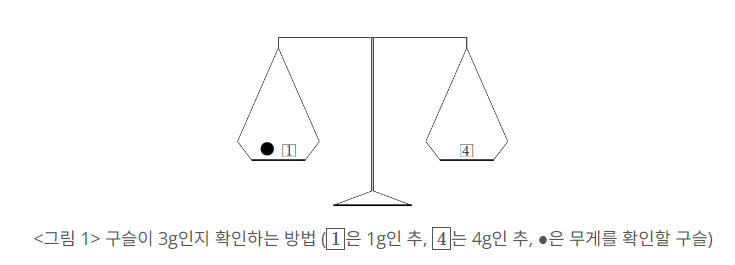 구슬이 3g인 경우 아래 <그림 1>과 같이 구슬과 추를 올려놓으면 양팔 저울이 수평을 이루게 된다. 따라서 각각 1g과 4g인 추가 하나씩 있을 경우 주어진 구슬이 3g인지도 확인해 볼 수 있다.
