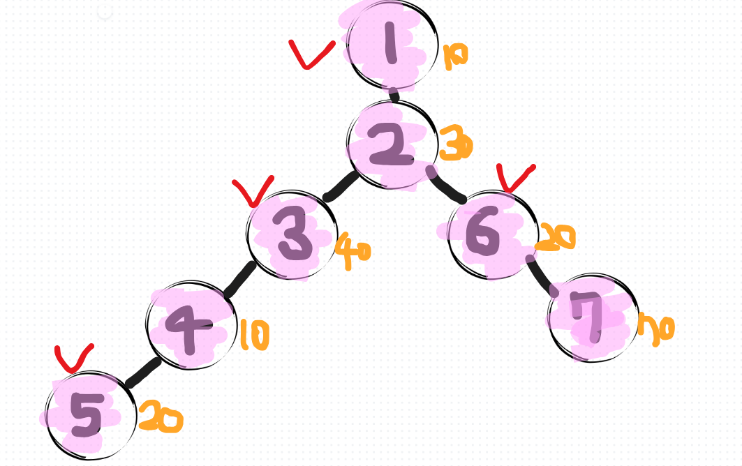 2. DFS 알고리즘은 깊이우선탐색으로 재귀함수로 가장 깊은 곳에서부터 리턴을 하게 된다. 위 예제라면 리턴 순서는 (5 -> 4 -> 3 -> 7 -> 6 -> 2 -> 1) 이다. 리턴 순서를 보면 DP로 각 노드가 선택되었을 때 최댓값, 선택되지 않았을 때 최댓값으로 판단해가며 구현할 수 있다는 아이디어를 떠올리는 것이 중요한 것 같다.