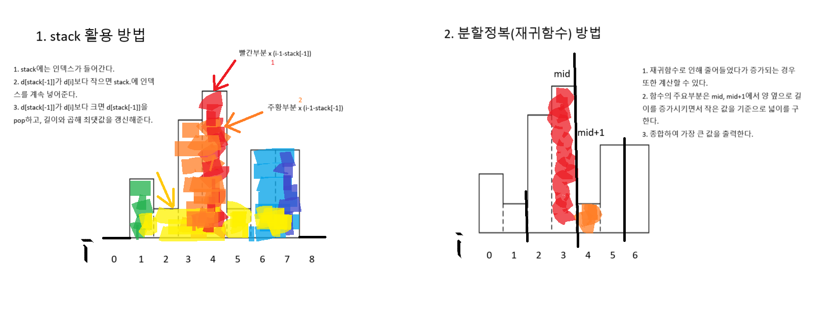 2. 분할정복 재귀함수의 경우 mid, mid+1로 나누어 양 옆으로 인덱스를 진행하며 직사각형의 높이 최소값에 길이를 곱해 최댓값을 갱신하는 방식으로 이루어진다. 갑자기 커지는 경우도 있으므로 재귀함수로 같은 방법으로 진행하며 누락되는 계산이 없도록 한다.