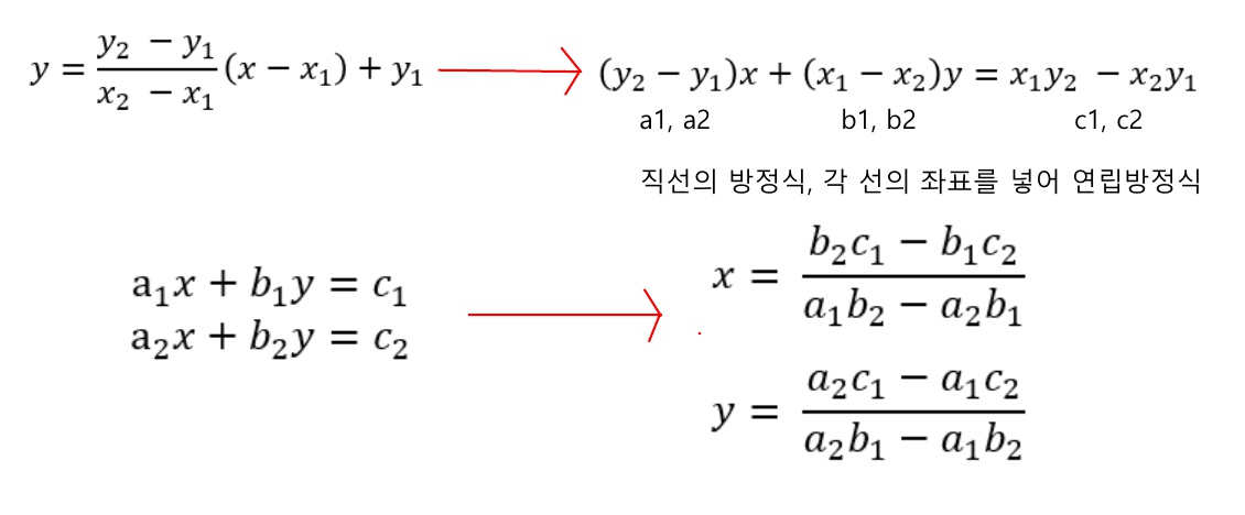 2) (x3, y3), (x4, y4) 직선에서도 각 점 (x1, y1) 과 (x2, y2)을 사선공식으로 돌린다. 위와 같다.