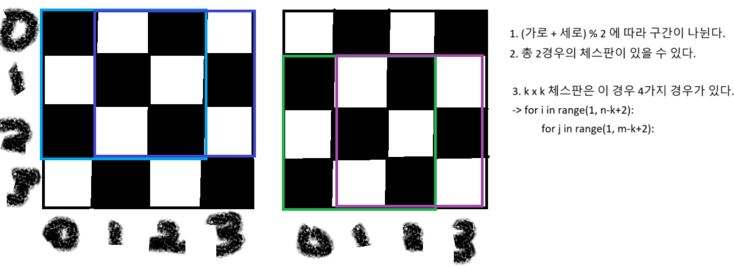 첫째 줄에 지민이가 잘라낸 K×K 보드를 체스판으로 만들기 위해 다시 칠해야 하는 정사각형 개수의 최솟값을 출력한다.