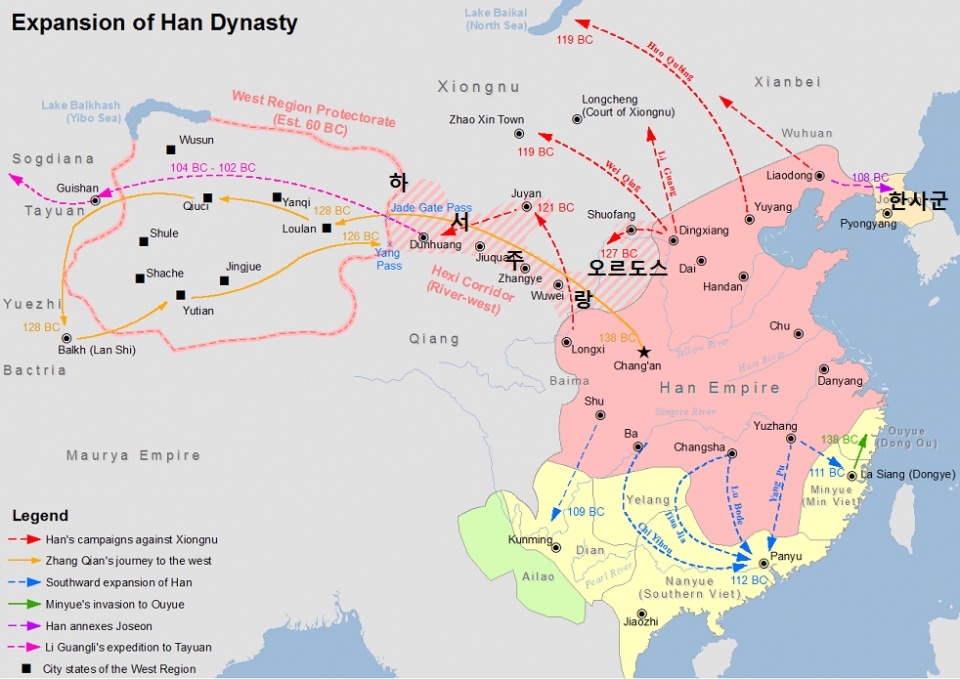 한무제(BC141~BC87)에 와서 드디어 한나라가 흉노에게 좀 개겨볼 수(?) 있는 정세가 되었다. 초반에는 물을 좀 말아먹었지만 외척인 명장 위청과 곽거병의 활약으로 서역으로의 통로에 해당하는 하서주랑 지역을 정벌하고 무위, 장액, 주천, 돈황의 하서 4군을 세우게 된다.(BC133~) 중국사 여러 명장들이 잘 싸워놓고도 숙청당하는 경우가 많았지만 위청, 곽거병은 황제가 밀어주는 외척이었기 때문에 등 뒤(?)를 걱정하지 않고 싸울 수 있었다. 막북전투(BC119)가 유명한데 곽거병은 현지에서 보급을 조달하며(약탈) 바이칼 호 유역까지 진출한다.